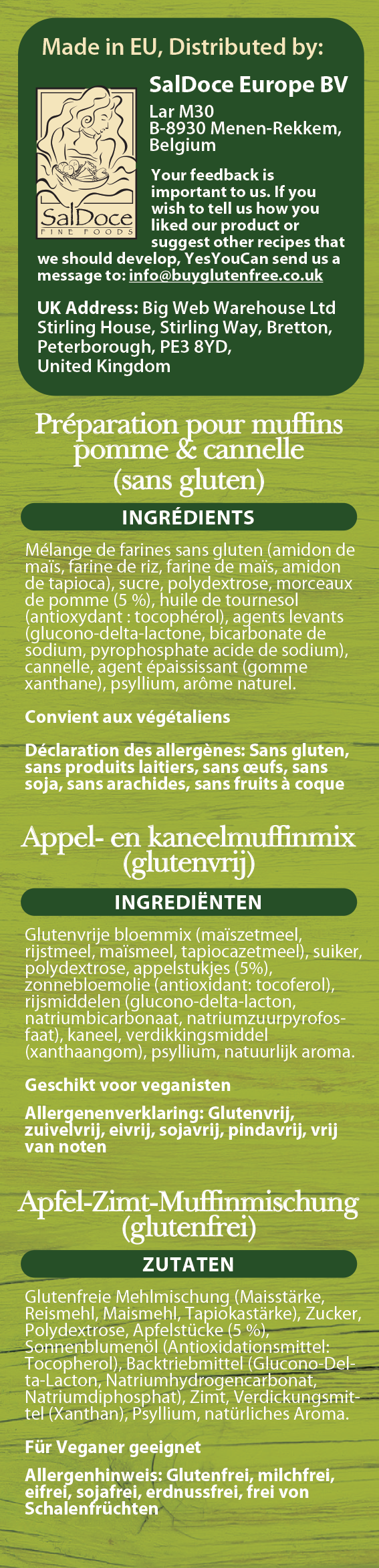 Apple & Cinnamon Muffin Mix contains real apple pieces for natural sweetness from fruit, with no compromise on taste. Great to bring a cafe experience in home, also good for kids lunchboxes.