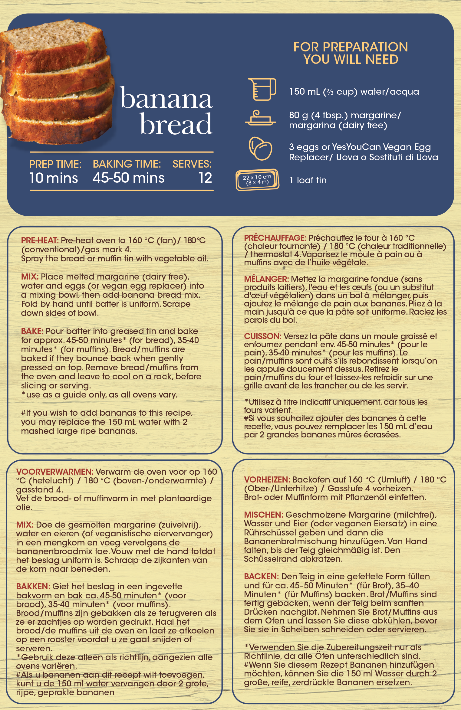 YesYouCan Banana Bread Mix includes real banana flakes for a delicious natural taste. Lightly spiced with cinnamon and nutmeg for a delicious café experience at home. Can be enjoyed fresh or toasted and served with a topping of your choice. Quick and easy to make, its perfect for busy families and great for morning tea or school lunchboxes.
