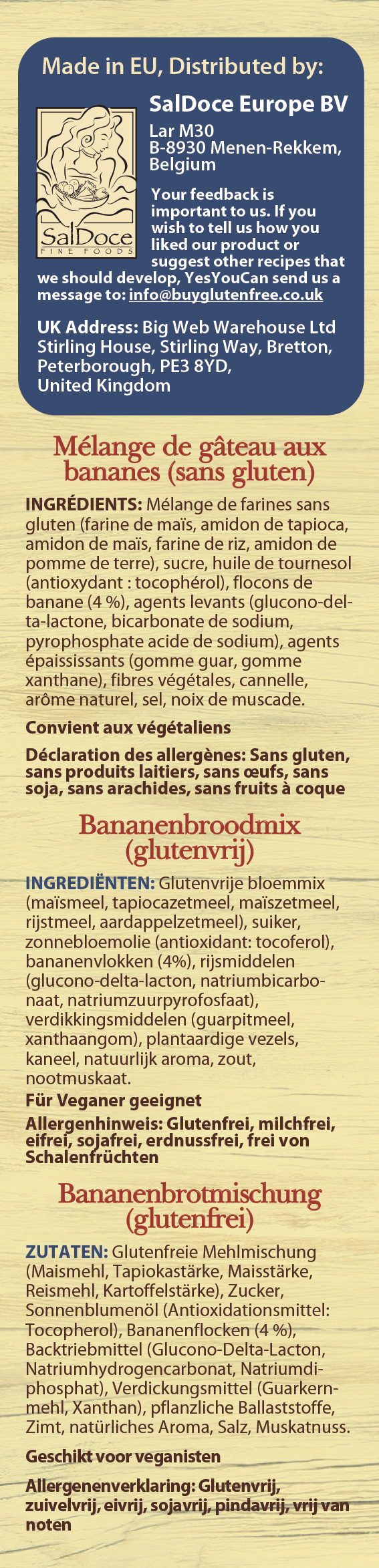 Sugar, Gluten Free Flours (maize & millet flour, maize, tapioca & potato starch), Sunflower Oil (antioxidant (tocopherol)), Banana Flakes (4%), Maltodextrin (maize), Raising Agents (glucono delta lactone, sodium bicarbonate, sodium acid pyrophosphate), Thickeners (xanthan gum, guar gum), Cinnamon, Natural Banana Flavour, Fibre, Salt, Nutmeg.
